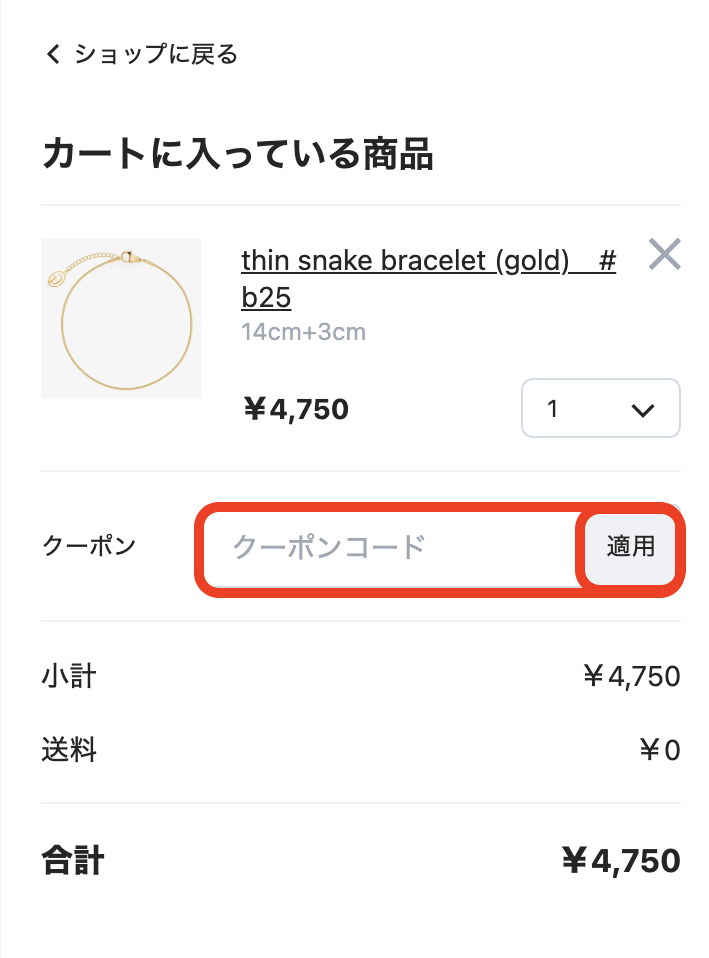 - クーポンの利用欄にクーポンコードを入力し、『適用』をクリックする