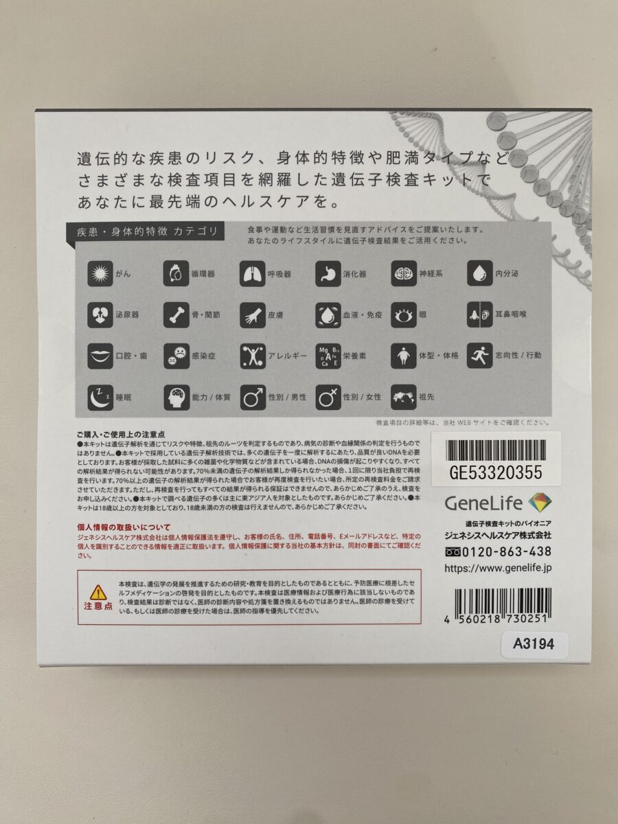 今回試してみたGeneLife Genesis2.0 Plus(ジーンライフ ジェネシス2.0プラス)は、ジーンライフの中でもベストセラーになっている検査キットで、唾液を摂取して検査機関に送るだけで、なんと約360項目を検査してくれる内容となっています。