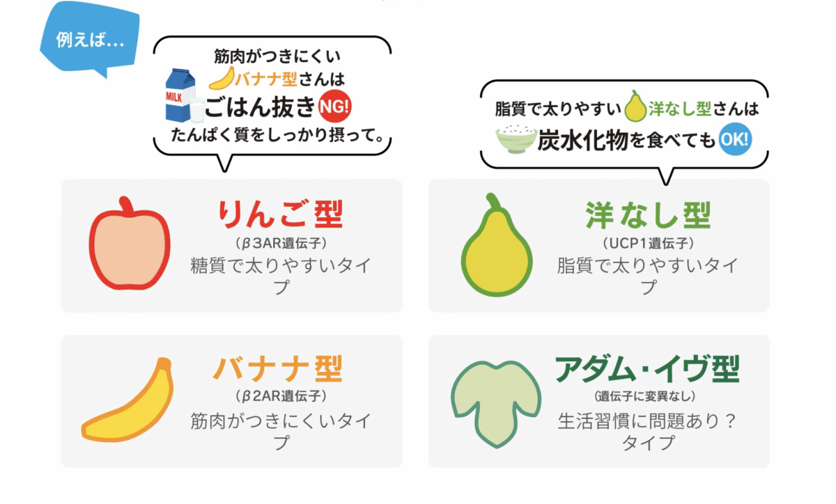 | 🍎 りんご型(β3AR遺伝子) | 糖質で太りやすいタイプ |