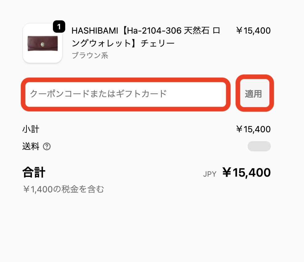 - クーポンコード・またはギフトコード欄にクーポンコードを入力し、『適用』をクリックする