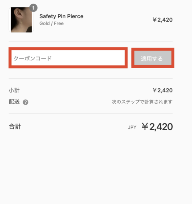- 支払い画面のクーポン欄よりクーポンコードを入力し『適用する』ボタンを押す