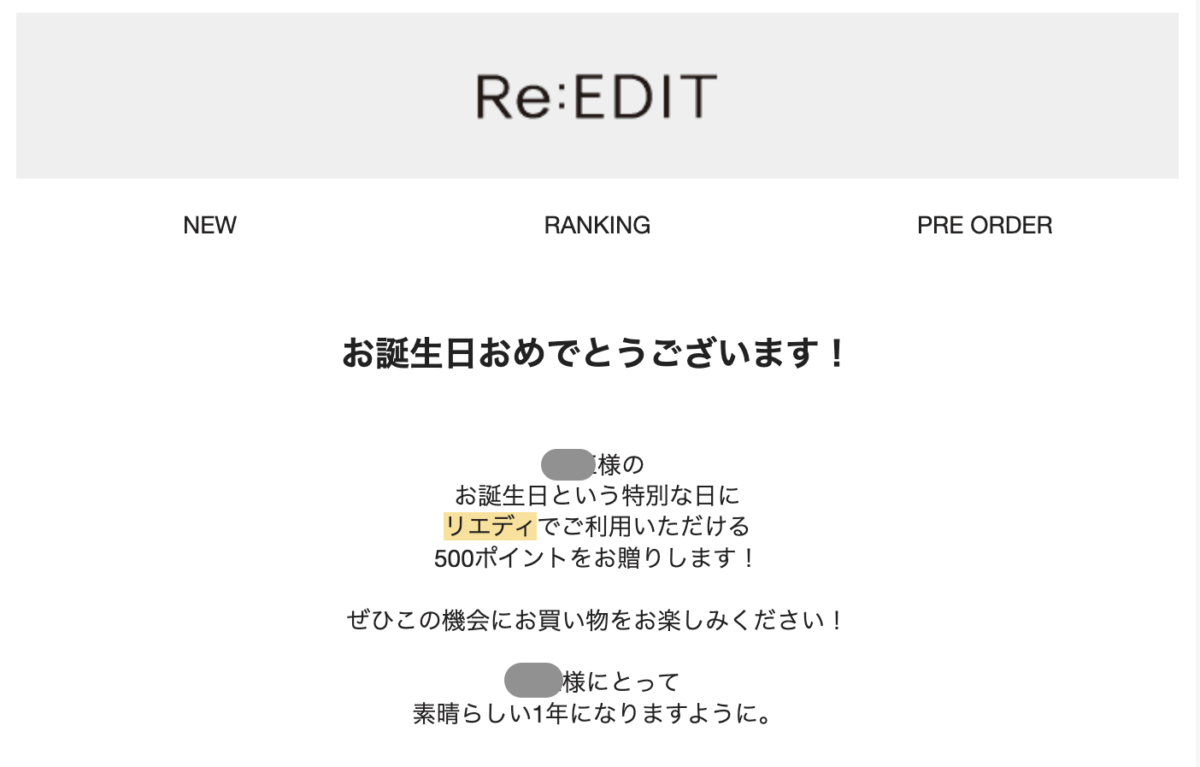 RE:EDIT(リエディ)公式サイトでは会員登録時にお誕生日を登録すると、お誕生月にクーポンをプレゼントしてくれます。