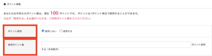 - ご注文情報入力画面で個人情報を確認し、ポイント情報欄のポイント使用から『使用する』にチェックをいれる